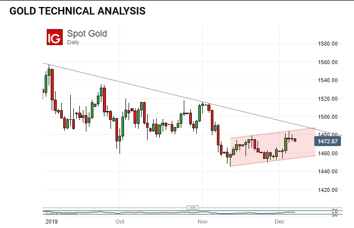 · นักวิเคราะห์จาก DailyFX กล่าวว่า ราคาทองคำปรับตัวเข้าสู่กรอบขาขึ้นระยะสั้นๆ โดยจะเห็นได้จากฐานฟอร์มตัวตั้งแต่ช่วงกลางเดือนพ.ย. แต่ภาพตั้งแต่จุดสูงสุดในเดือนก.ย. ปี 2019 ก็ดูจะเห็นเป็นภากที่ราคาปรับตัวลดลงมาอย่างต่อเนื่อง