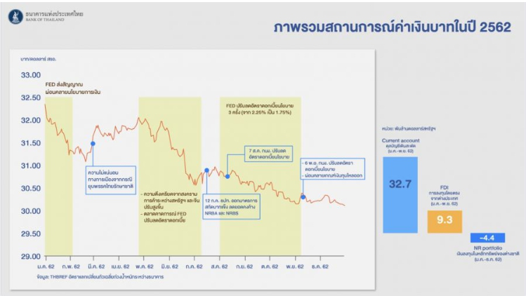 นอกจากนี้ ความเข้าใจว่าเงินบาทแข็งค่าขึ้นจากการเก็งกําไรระยะสั้นของนักลงทุนต่างชาติเป็นความเข้าใจที่คลาดเคลื่อน หากดูตัวเลขจะเห็นว่าการลงทุนของต่างชาติสุทธิทั้งปี 2019 แล้วเป็นการไหลออกโดยเฉพาะในช่วงครึ่งปีหลัง