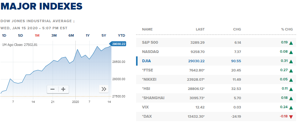 · ดัชนีดาวโจนส์ปิดปรับขึ้น 90.55 จุด หรือ +0.31% ที่ 29,030.22 จุด ซึ่งเป็นการปิดเหนือ 29,000 จุดเป็นครั้งแรก ทางด้าน S&P500 ปิด +0.19% ที่ 3,289.3 เหรียญ ก็เป็นระดับปิดสูงสุดเป็นประวัติการณ์เช่นกัน ในส่วนของ Nasdaq ปิด +0.08% ที่ 9,258.7 จุด ยังคงปิดใกล้ระดับสูงสุดประวัติการณ์ที่ทำไว้เมื่อวันจันทร์ที่ผ่านมา โดยตลาดขานรับกับการลงนามข้อตกลงการค้าเฟสแรกที่ช่วยลดความผันผวนและจะนำมาซึ่งการแก้ไขปัญหาภาษีการค้าระดับสูงของทั้งสองประเทศ โดยที่จีนจะเข้าซื้อสินค้าจากสหรัฐฯเพิ่มไม่น้อยกว่า 2 แสนล้านเหรียญในช่วง 2 ปี ซึ่งจะเป็นการเพิ่มขึ้นจากระดับ 1.86 แสนล้านเหรียญในปี 2017