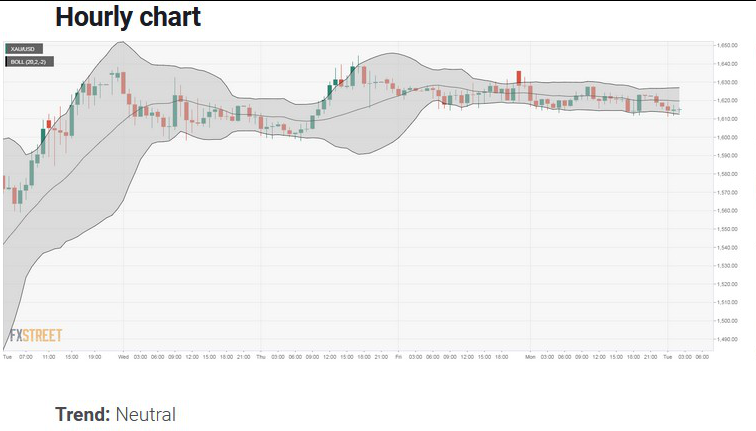 บทวิเคราะห์จาก FX Street ระบุว่าราคาทองคำยังคงเคลื่อนไหวในกรอบระหว่าง 1,610 – 1,630 เหรียญติดต่อกัน 3 วันทำการ ขณะที่เส้น Bollinger bands เริ่มเคลื่อนไหวแคบลง