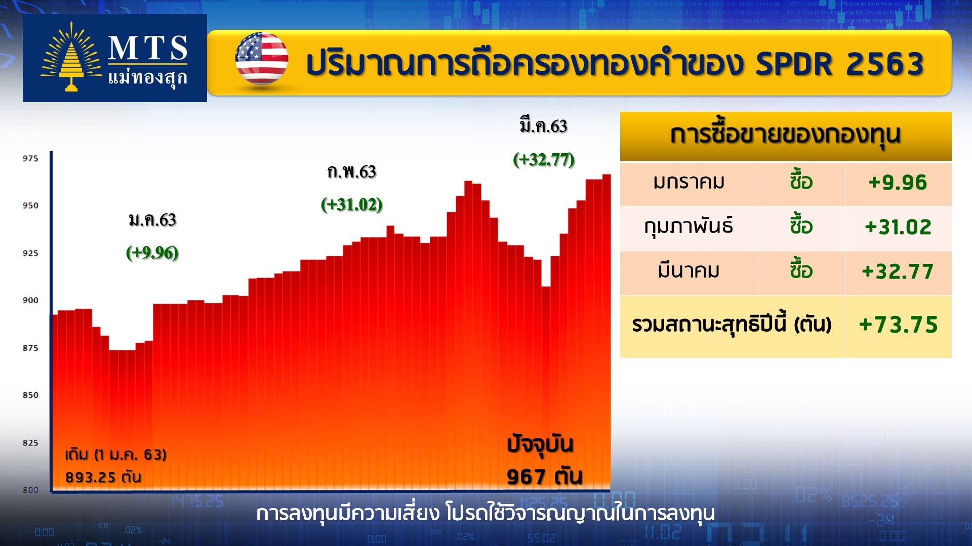 · กองทุน SPDR เมื่อวานนี้ทำการซื้อทองคำเพิ่ม 2.64 ตัน โดยปัจจุบันถือครองทองคำที่ระดับ 967 ตัน
