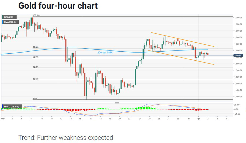 ดังนั้นราคาทองคำจึงยังเคลื่อนไหวอยู่ในแนวโน้มขาลงที่ก่อตัวมาตั้งแต่เมื่อสัปดาห์ก่อน และยังอยู่ต่ำกว่าเส้นค่าเฉลี่ยราย 200 วันและระดับ 61.8% Fibonacci retracement ระหว่างวันที่ 9 – 16 มี.ค.