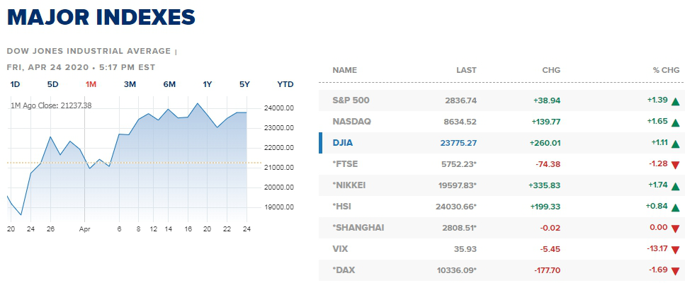 · ตลาดหุ้นสหรัฐฯปิดปรับขึ้นในคืนวันศุกร์ ท่ามกลางกลุ่มนักลงทุนที่ตอบรับกับการใช้มาตรการกระตุ้นเศรษฐกิจและการรีบาวน์ของราคาน้ำมันดิบในสัปดาห์ที่แล้ว โดยดัชนีดาวโจนส์ปิด +260 จุด หรือ +1.1% ที่ 23,775 จุด ทางด้านดัชนี S&P500 ปิด +1.4% ที่ 2,837 จุดและ Nasdaq ปิด +1.7% ที่ 8,635 จุด