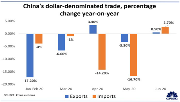 การส่งออก-นำเข้าของจีนในรูปค่าเงินดอลลาร์เพิ่มขึ้นในเดือนมิ.ย. ท่ามกลางการผ่อนคลายมาตรการต่างๆ และหลายๆประเทศก็กลับมาเปิดทำการทางเศรษฐกิจ โดยข้อมูลภาษีศุลากรเผยข้อมูลยอดส่งออกพุ่งขึ้นกว่าที่คาดแตะ 0.5% เมื่อเทียบปีที่แล้ว ขณะที่ยอดส่งออกก็ปรับขึ้นเกินคาดเช่นกันที่ 2.7% เมื่อเทียบกับช่วงเดียวกันของปีที่แล้ว